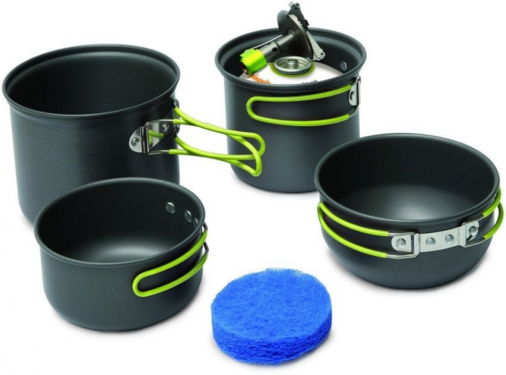 V malém hrnci lze pohodlně přenášet 230g kartuši, malý plynový vařič, utěrku a houbičku na nádobí. Kartuše, vařič ani utěrka nejsou součástí balení.