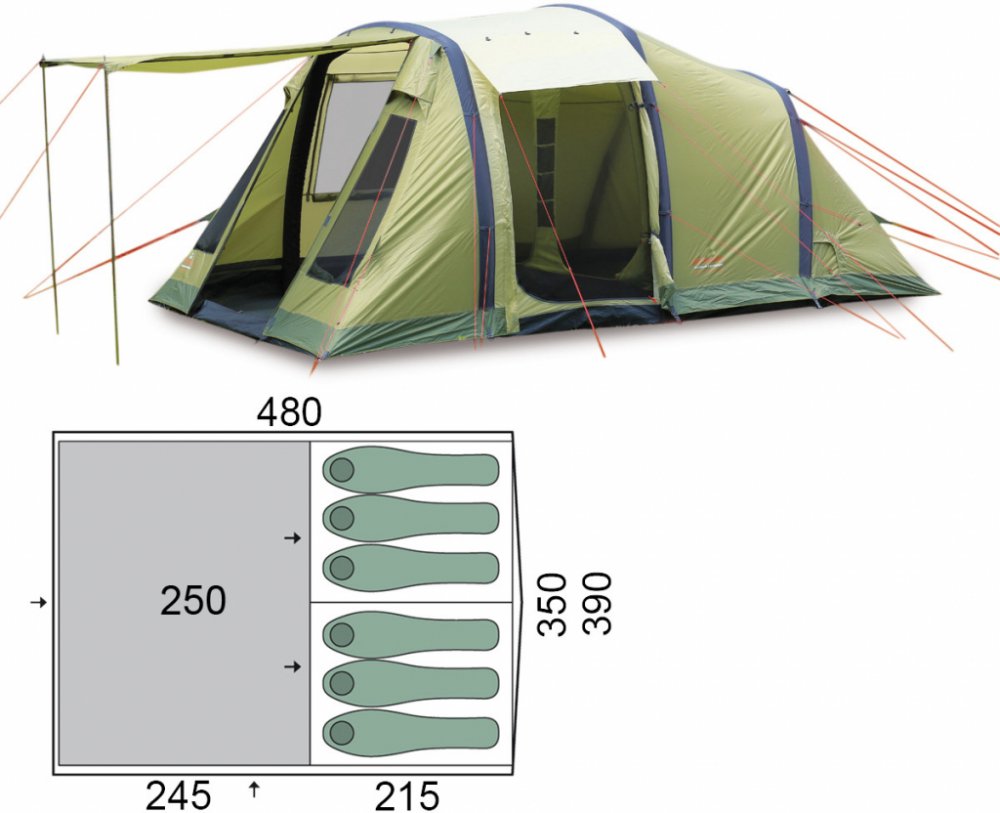 Prostorný nafukovací stan s variabilním uspořádáním dveří a prostrornou předsíní má dostatek prostoru pro 6 osob. Díky použití technologii Airtube je jeho stavba velmi snadná a rychlá.