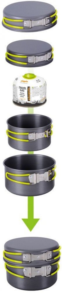 Dva hrnce se dvěma poklicemi sloužícími také jako pánve. Set je vyroben z hliníku s anodizovaným povrchem. Sklopné rukojeti jsou vyrobeny z ocelového drátu, opatřeného silikonovou žáruvzdornou bužírkou.