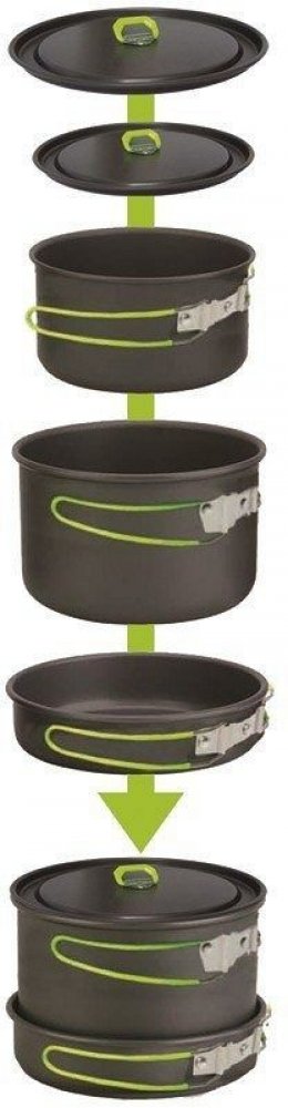 Set campingového nádobí vyrobený z hliníku s anodizovaným povrchem. Sklopné rukojeti jsou vyrobeny z ocelového drátu, opatřeného silikonovou žáruvzdornou bužírkou, rukojeti poklic jsou plastové.