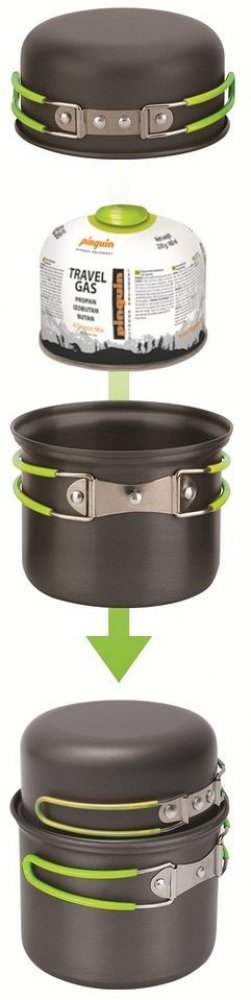V hrnci lze pohodlně přenášet 230g kartuši, malý plynový vařič, utěrku a houbičku na nádobí. Toto příslušenství není součástí balení.