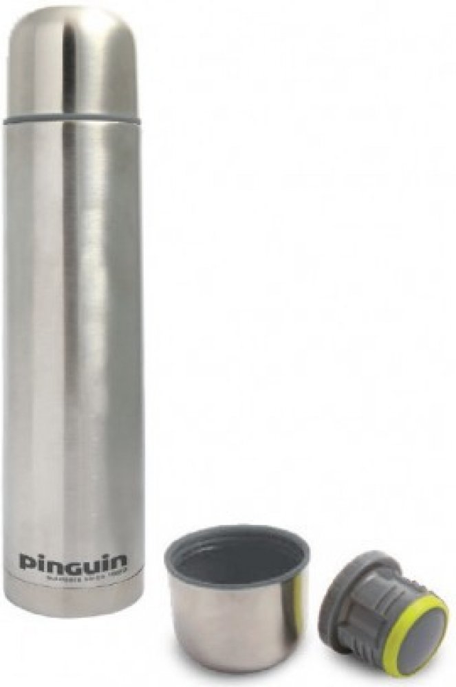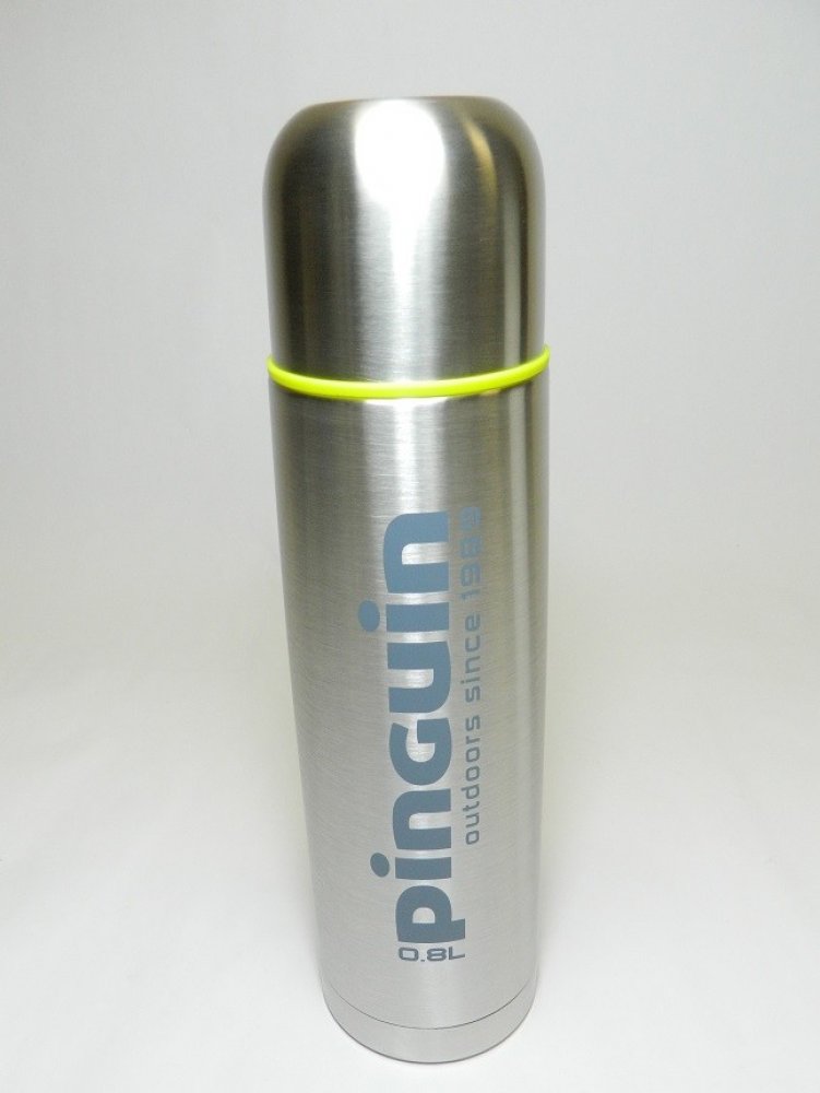 Nerezová termoska se šroubovacím uzávěrem o objemu 0.8L Vacuum Thermobottle 0.8L Nerezová dvoustěnná vakuová termo láhev o objemu 800 ml se šroubovacím uzávěrem a hrnkem. Použitá potravinářská nerezová ocel 18/8. Broušený povrch termosky poskytuje stálý vzhled zakrývající případné škrábance. Vnější design je opatřen šedým logem Pinguin. Po 24 hodinách vroucí nápoj o počáteční teplotě 95°C v termosce dosahuje teploty okolo 64°C za venkovních podmínek 18°C. Láhev lze vložit do hrnku Alu Mug i Steel Mug a šetřit tak místo při balení. Uzávěr a hrnek v jednom Součástí termosky je vnější uzávěr, který zároveň slouží jako hrnek pro váš oblíbený nápoj. Vnitřní část hrnku je vyrobena ze zdravotně nezávadného polypropylenu BPA free (využíván např. u kojeneckých lahví, plastových příborech atd.), tento polypropylen je protažen až k okraji hrnku, což umožní vyšší komfort při pití. Jednoduchý šroubovací uzávěr Uzávěr termosky je opatřen závitem a silikonovým těsněním. Závit je na dvou stranách přerušen - pro nalévání není nutné úplné odšroubování. Uzávěr i těsnění je vyrobeno také ze zdravotně nezávadného polypropylenu BPA free a silikonu.
