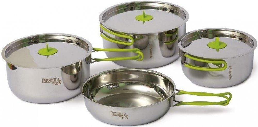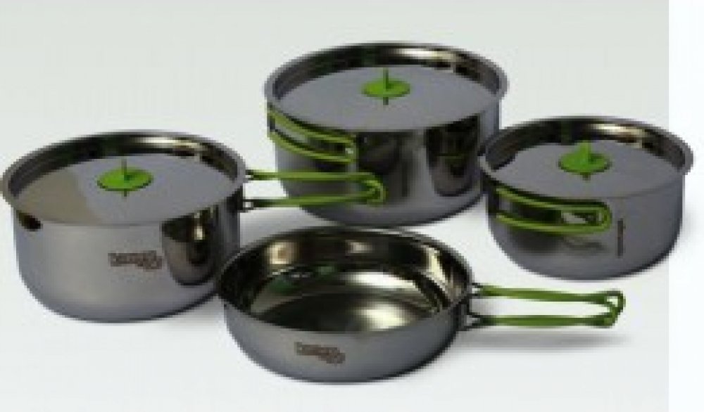 Set campingového nádobí pro pět až osm osob vyrobený z nerezové oceli. Sklopné rukojeti jsou vyrobeny z ocelového drátu, které jsou potaženy žáruvzdorným silikonem. Rukojeti poklic jsou taktéž silikonové.