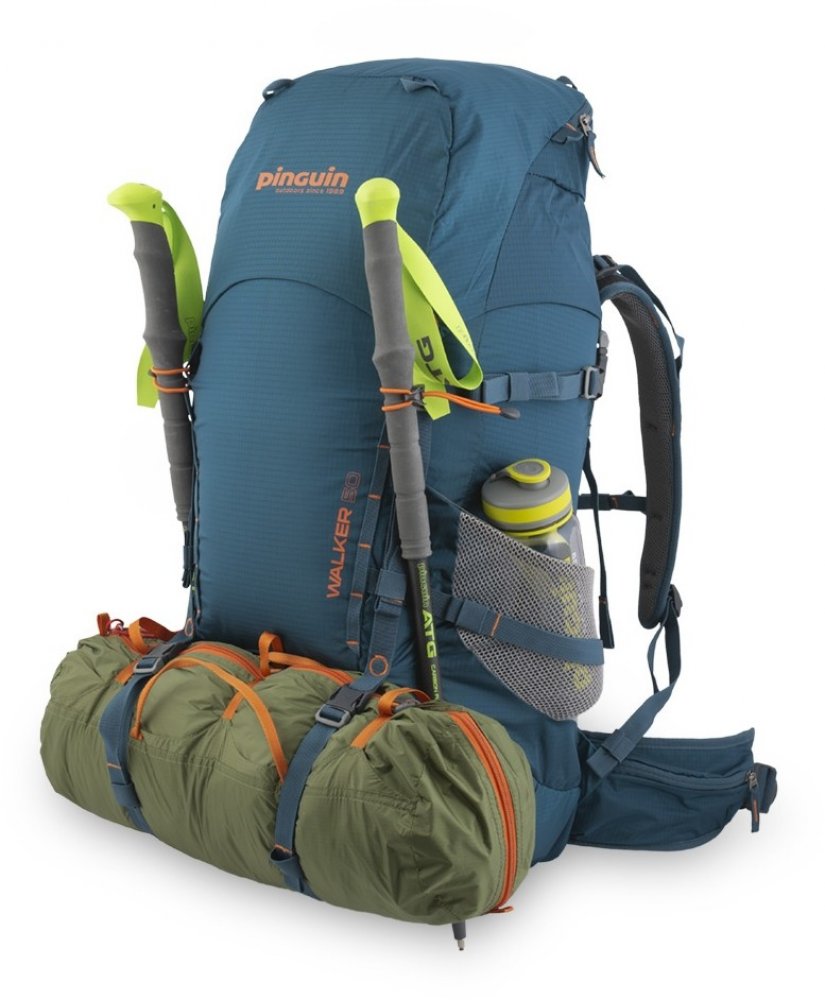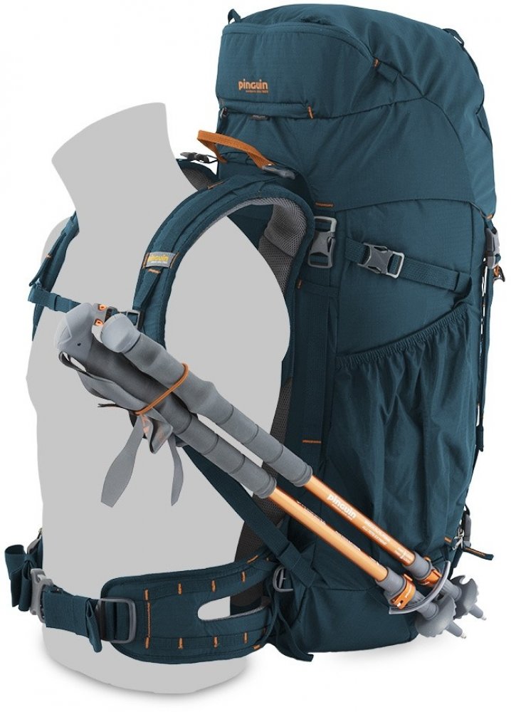 Pružná poutka s háčky na připevnění trekových holí na čele a poutka na dně batohu.