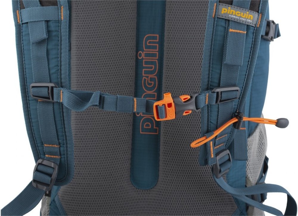 Výškově nastavitelný a odepínatelný hrudní popruh s píšťalkou pro případ nouze.