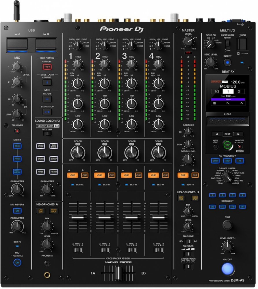 Digitální mixážní pult Čtyřkanálový mixážní pult Pioneer DJ DJM-A9 vyhoví nejvyšším nárokům profesionálních klubových DJs. Oproti svému předchůdci DJM-900NXS2 se může pochlubit značnou porcí vylepšení, jímž dominuje úžasně čistá kvalita zvuku, vylelepšené možnostmi přehrávání a připojení i řada nových funkcí, které vám pomohou posunout vaše vystoupení na vyšší úroveň. Navzdory všem inovacím si zachovává funkce a uspořádání, které se staly klubovými standardy. Úžasně čistá kvalita zvukuVstupní i výstupní sekce mixpultu je vybavena 32 bitovým, špičkovým AD/DA převodníkem ESS Technology pro křišťálově čistý zvuk s vysokým rozlišením. Za prémiovým převodníky nezaostává ani lepší mikrofonní předzesilovač a sluchátkový výstup. Pokročilé ovládáníVětší rozestupy kolem knoflíků ekvalizéru vám dávají lepší prostor pro ovládání a vysoce kvalitní, jasné LED diody v kanálové sekci usnadňují vizuální přehled o úrovni zvuku. Díky frekvenční odezvě EQ / isolater, které byly optimalizovány tak, aby co nejlépe využily nejnovější rysy hudební produkce, můžete hrát dynamičtěji než kdykoli předtím. A díky kvalitnějším channel faderům a crossfaderu MAGVEL FADER třetí generace si můžete vychutnat opravdu hladké míchání a rychlý a stabilní scratching. Color FX a Center LockVyzkoušejte zbrusu novou funkci Center Lock a při používání oblíbeného knoflíku Sound Color FX se každý knoflík přestane otáčet, jakmile dosáhnete středové polohy. To znamená, že můžete knoflíkem otáčet tak rychle, jak se vám zlíbí, a přenést efekt až na maximum parametru hi nebo na minimum parametru low, aniž byste riskovali, že zajdete příliš daleko a přepnete na opačný parametr. Když vypnete funkci Center Lock, knoflíky Sound Color FX pracují stejně jako knoflíky na DJM-900NXS2. Beat FXNový barevný displej vám pomůže rychle a přesně kontrolovat stav vybraného efektu, k dispozici je indikace osvětlením, které odpovídá horizontálnímu uspořádání X-Padu, což umožňuje intuitivnější ovládání jednoduchým posunem prstu. Pomocí tlačítka X-Pad můžete měnit efekty Echo a Ping Pong a vytvářet tak jedinečný analogový zvuk ve stylu páskových efektů. A v rámci celkového počtu 14 Beat FX jsou k dispozici 3 nové (Mobius, Triplet Filter a Triplet Roll), které můžete použít pro další variabilitu svých vystoupení. Přepínač kanálů je nyní vybaven vyhrazeným tlačítkem, které vám umožní rychle použít efekty na vybraný kanál. Vylepšená mikrofonní sekceDíky vstupu s fantomovým napájením můžete k DJM-A9 přímo připojit vysoce kvalitní kondenzátorový mikrofon a n jen obyčejný dynamický handheld. K dispozici jsou také 3 nové mikrofonní efekty (Echo, Pitch, Megaphone) se speciálním efektem reverbu, takže můžete změnit zvuk svého hlasu a rozproudit dav svými vokály. Pomocí nového tlačítka Push To Talk snadno a rychle zapnete nebo vypnete mikrofonní vstup. Rozšířená konektivitaPřipojte 2 různé systémy PC/Mac současně díky dvěma USB portům (k dispozci jsou USB typu B a USB typu C). Díky vstupu Bluetooth®, který můžete nasměrovat do libovolného kanálu na DJM-A9, můžete do svých setů bezdrátově pouštět zvukové stopy z jiných zařízení, například chytrých telefonů, a využívat všechny funkce a efekty mixážního pultu ke změně zvuku. Sekce Multi I/O má nezávislý přepínač kanálů, takže externí efekty lze používat odděleně od Beat FX, což dává DJM-A9 skutečné možnosti pro send FX. Dva nezávislé výstupy pro sluchátkaPřipojte svá sluchátka současně s jiným DJem a užívejte si svobody při monitorování kanálů, které chcete. Díky samostatným tlačítkům cue, knoflíkům hlasitosti a knoflíkům vyvážení mixu pro každou sadu sluchátek mohou 2 DJové snadno navázat skladby během výměny setů back-to-back. K dispozici je také podpora zcela nové aplikace Stagehand a vestavěné funkce Sound Check, Serato DVS a rekordbox, DJM-REC či synchronizace s video obsahem a osvětlením.