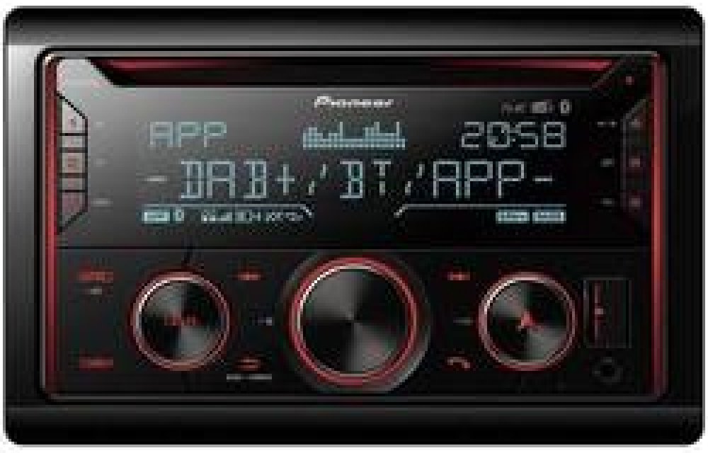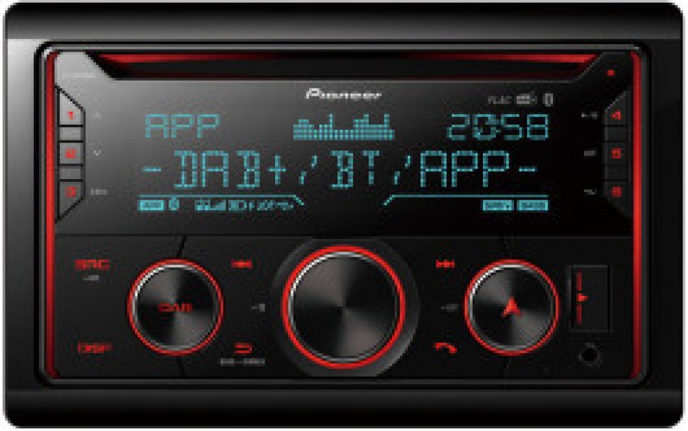 CD tuner 2-DIN s DAB/DAB+ digitálním rádiem·Bluetooth®·RGB osvětlení a podsvícení displeje lze přizpůsobit interiéru každého vozu.·USB konektor·App Spotify a Pioneer Smart Syn·Kompatibilní se smartphony Apple a Android Upevňovací materiál·.·ISO připojovací kabel.