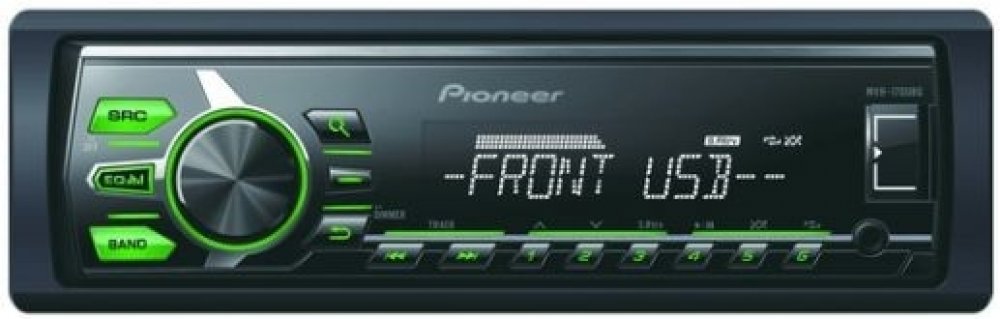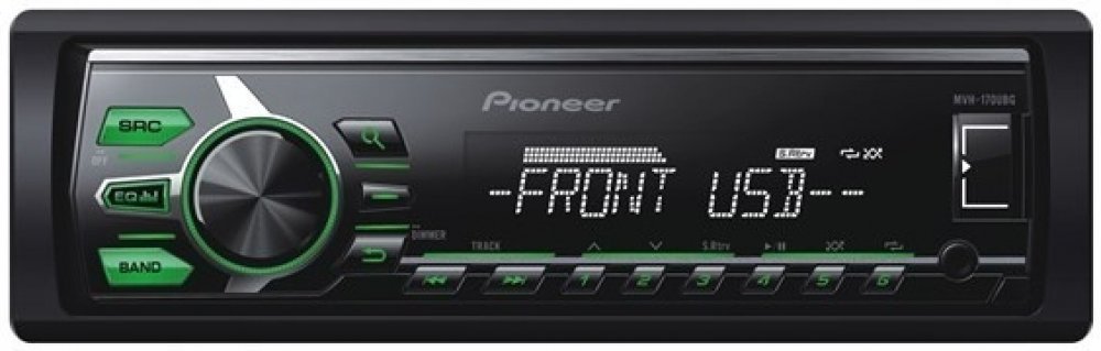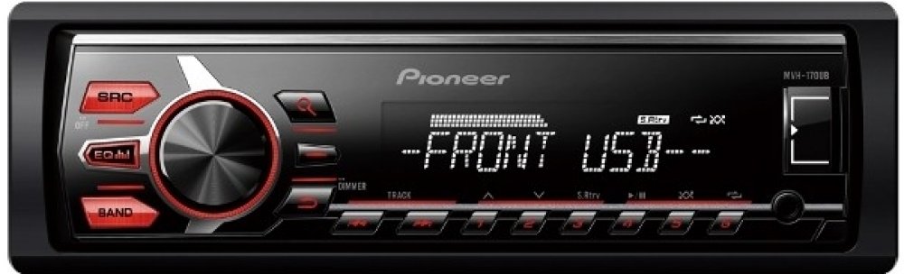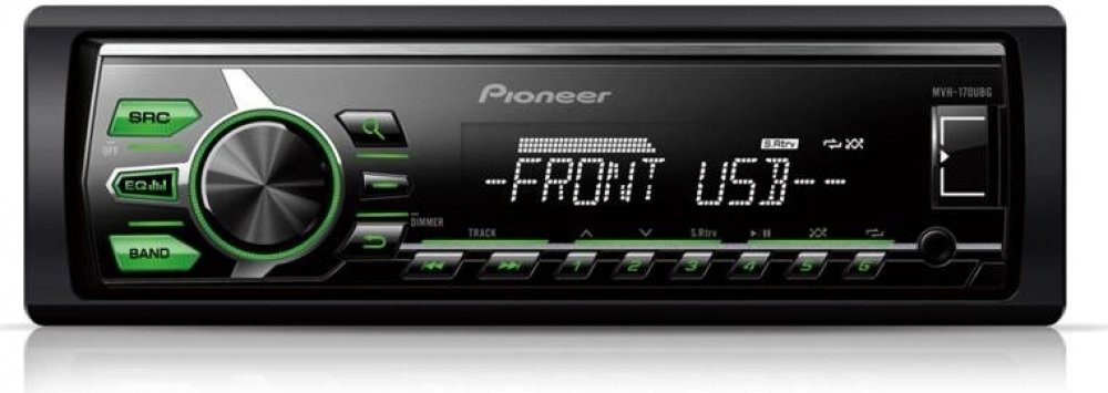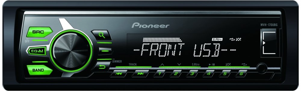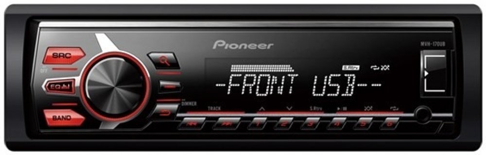 U autorádia Pioneer MVH-170UB nenajdete mechaniku CD. Umožní přehrát formáty MP3, WMA, AAC a přes USB. AUX vstup na čelním panelu pro připojení MP3 přehrávače, nebo jiného zdroje. Autorádio má červené podsvícení tlačítek. Výstup předzesilovače je 2V a lze ho přepnout na frekvenci subwooferu. Výkon zesilovače je 4 x 50W MOSFET.
