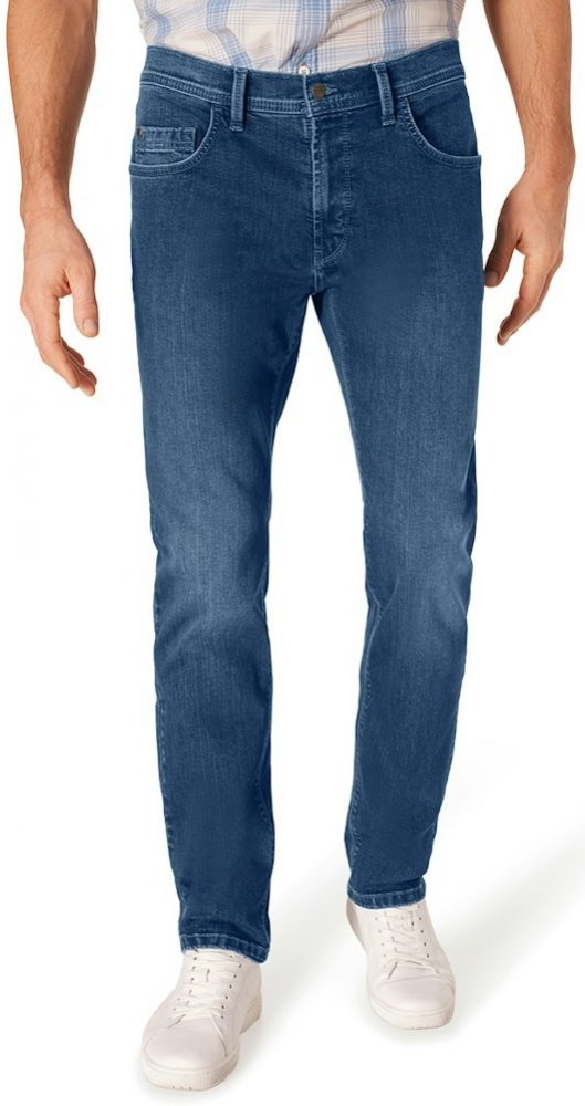 Klasické pánské pěti kapsové džíny střihu RANDO se středním, vzadu mírně vyšším sedem a rovnými nohavicemi. Rifle jsou vyrobeny z tmavě modrého denimu o střední gramáži a mají lehké šoupání. Díky příměsi elastanu jsou pružné a pohodlné. Džínsy jsou prošity dvojitým stehem v modrém tónu včetně originálního ozdobného prošití zadních kapes a mají mosazné nýty a knoflík s logem značky. Vzadu na pasu n...