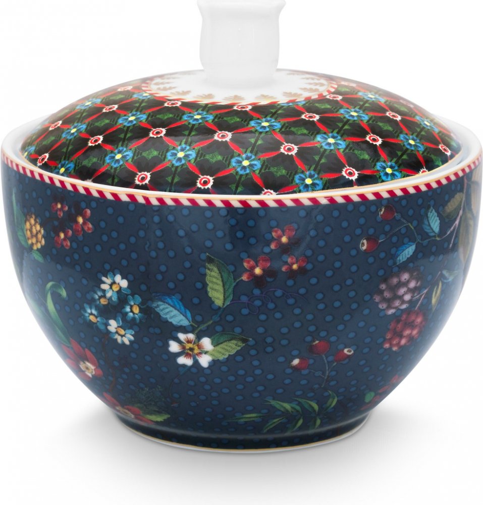 Cukřenka s víčkem o objemu 300 ml je zdobená po obvodu elegantním vzorem barevných květin a lesních plodů na modrém podkladu, víčko je zdobené dekorem Clover (čtyřlístky). Projděte si celou kolekci Berry Blues, která vybízí k vytváření osobitých kombinací harmonických vzorů. Cukřenky jsou v nabídce také v jiných dekorech a barvách.