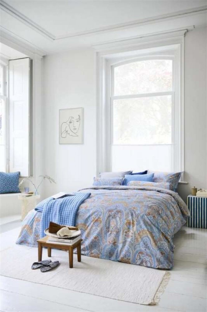 Toto perkálové povlečení je pokryto složitým ornamentem, vyskládaným z drobných květin, které vyniká sytostí své šmolkově modré barvy a jemností všech detailů. Sytá modř, připomínající barvu jasné letní oblohy podtrhují tóny světle hnědé a rezaté a dávají vyniknout všem něžným květinovým motivům. Polštáře se zapínají na tři látkové knoflíky, povlak na přikrývku má zapínaní na zip.