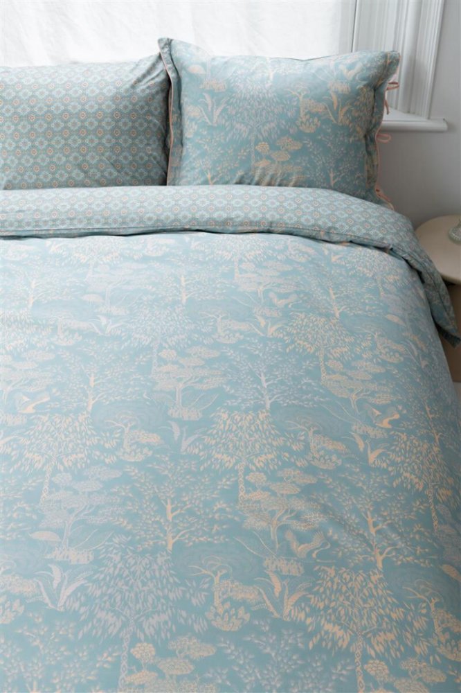 Překrásné povlečení vyobrazuje idylickou rajskou zahradu, kterou protéká řeka a v té chytá ryby volavka nebo jeřáb. V zahradě také rostou rozličné stromy, poletují drobné lampionky a je plná barev a krásy. Bude to pastva pro vaše oči. Ve světle modré barvě, doplněné jemnou lososovou. Povlak na polštář se zavazuje na mašličky a povlak na přikrývku se zapíná zipem.