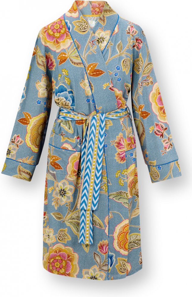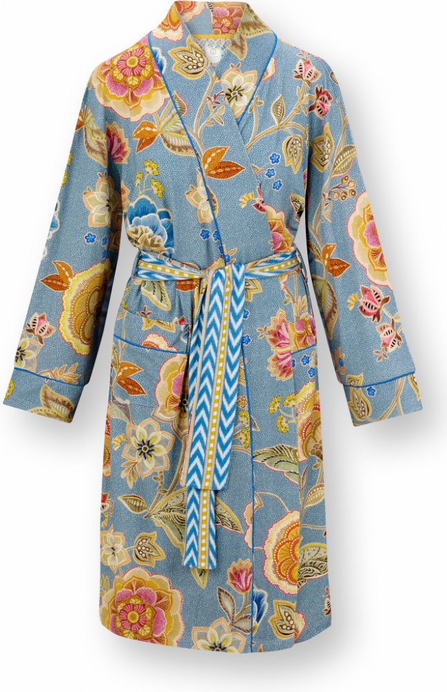 Lehké, velmi ženské kimono s širokým měkkým páskem z kolekce Matata. Elegantní světle modrá barva je bohatě zdobená květinovým motivem. Látka je velmi jemná, splývavá, díky 5% elastanu se krásně přizpůsobí Vašim křivkám.