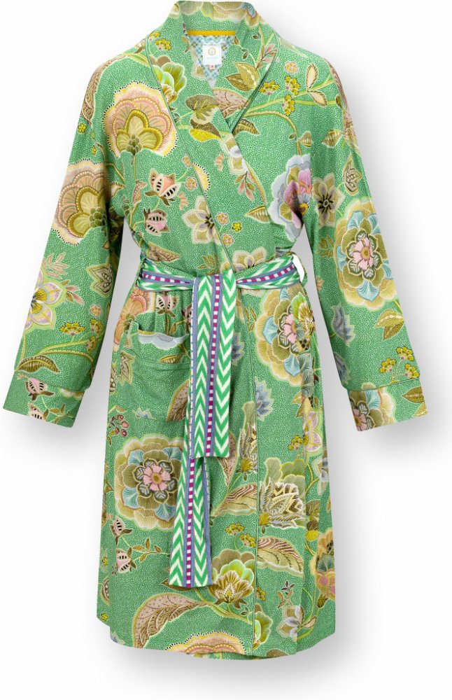Lehké, velmi ženské kimono s širokým měkkým páskem z kolekce Matata. Elegantní světle zelená barva je bohatě zdobená květinovým motivem. Látka je velmi jemná, splývavá, díky 5% elastanu se krásně přizpůsobí Vašim křivkám.