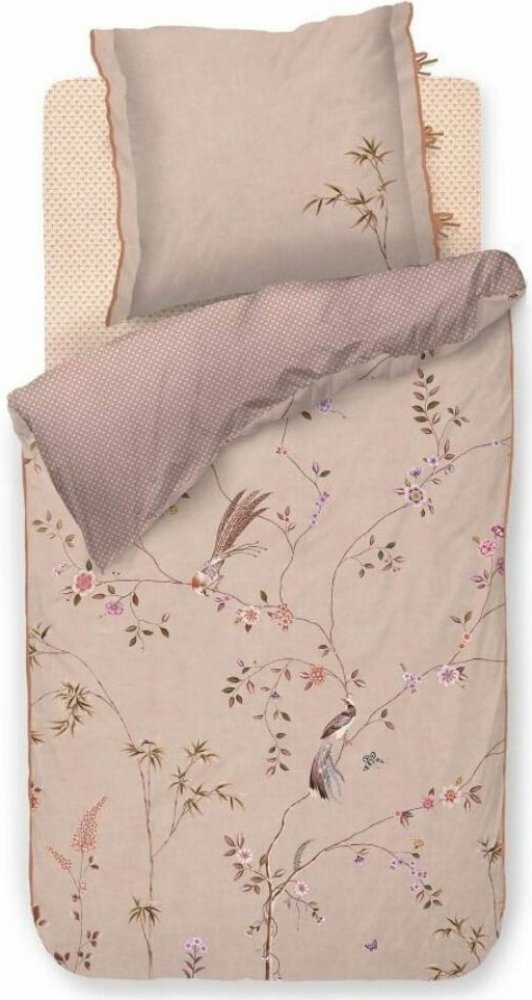 design povlečení zdobí jemné motivy květin, bambusových výhonků a ptáků na jemně pískovém pozadí