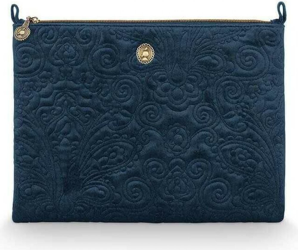 Větší ploché kosmetické pouzdro, vyrobené z temně modrého sametu má nepromokavou podšívku a uvnitř kapsu na zip. Na předním dílu ji zdobí kovové logo Pip. Prošívaná kosmetická taštička se hodí na cestování stejně jako na ukládání dekorativní kosmetiky či jiných drobností.