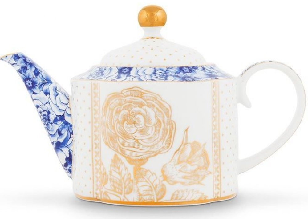 Větší čajová konvice s hubičkou zdobenou modrými květy a velkými zlatými růžemi a tečkami.