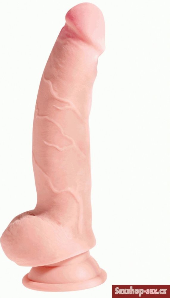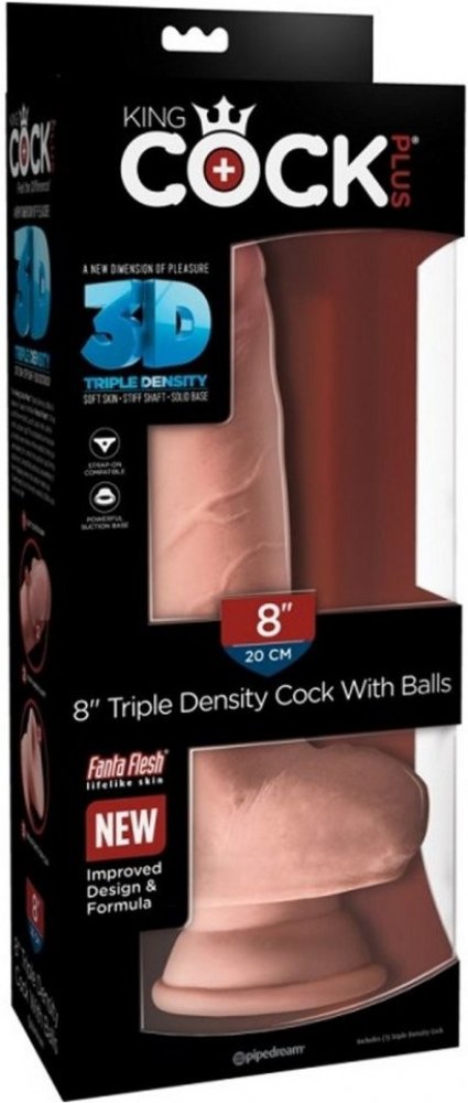 King Cock 8 Triple Density Cock With Balls flesh má vylepšený design a novou recepturu 3D. Realistické velké dildo s varlaty a širokou základnou má uvnitř pevné jádro, které věrně napodobuje tvrdou erekci a měkký realistický povrch imitující měkkou kůži na povrchu.
