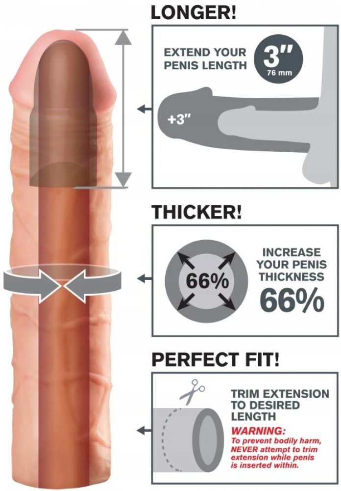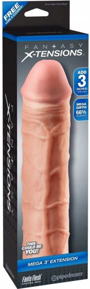 Mega 3" Extension je přizpůsobitelný návlek, jehož délku lze snadno upravit tak, aby perfektně padl. Je velmi pružný, aby se přizpůsobil každé velikosti a dostatečně pohodlný, pro vaši delší výdrž. Váš partner si bude užívat hlubší penetraci s prodloužením 3" (7,6 cm) na špičce, zatímco ultra-realistické tělo přidá 66% obvodu vašeho penisu. Měkký materiál Fanta Flesh pocítíte jako Vaši druhou kůži, která vám přidá délku, obvod, a důvěru, potřebnou pro uspokojení vaší drahé polovičky.