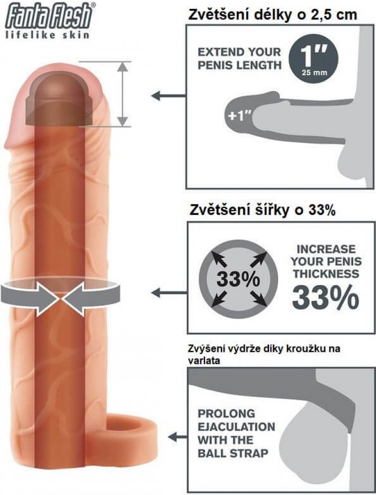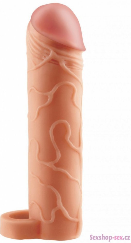 Detailně propracovaný realistický návlek prodlouží penis o 2,5 cm. Na objemu zbytníte o 33%.