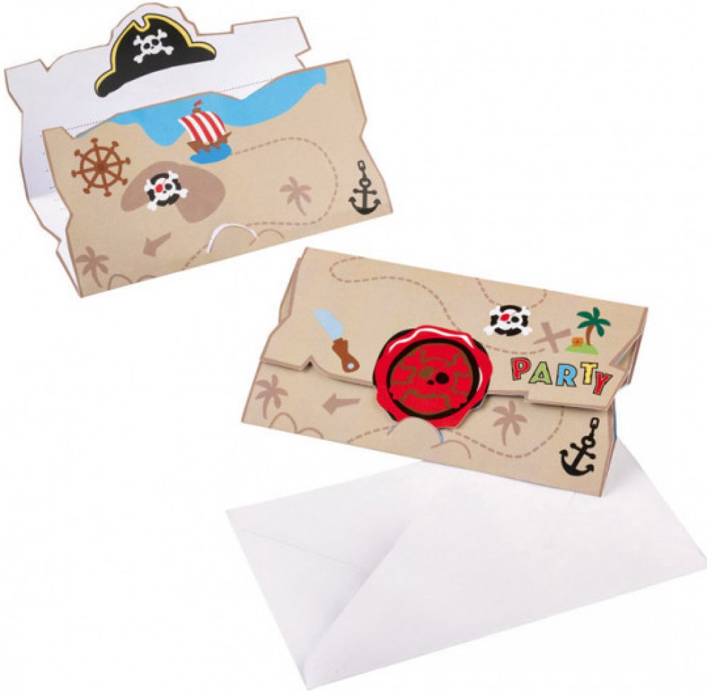Piráti pozvánky na party 8 ks Líbila by se Vám pirátská oslava? Pokud ano, právě tento produkt je vhodný pro pirátskou dekoraci. Pirátská párty je oblíbeným motivem pro i malé oslavence. Kompletní pirátská výzdoba je pro Vás připravená v sekci Pirátská párty