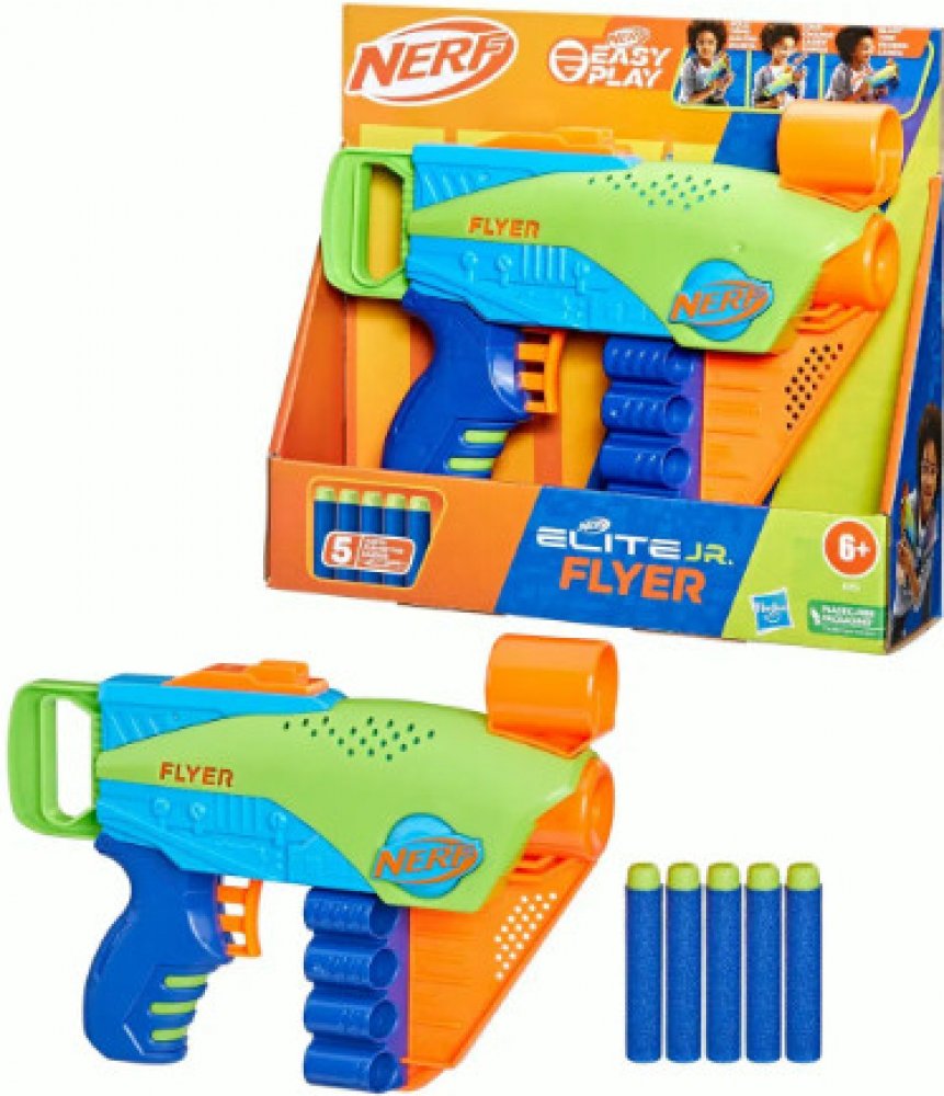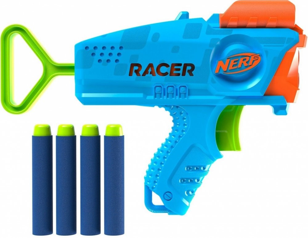 Tento lehký a snadno ovladatelný blaster je určen pro děti, které s hrou od značky NERF začínají. Díky kompaktní velikosti dobře padne do menší ruky, je snadno přenosný a manipulace s ním je jednoduchá i pro mladší děti — zbraně se nabíjejí dopředu a natahování vyžaduje jen minimální sílu. Pistole vystřeluje pěnové náboje (šipky), které jsou měkké a vhodné pro bezpečnou hru doma i venku. Jednoduše: „vlož – nabij – vystřel“ a hra může začít. Balení obsahuje – 1 × blaster „Elite?Jr?Racer, 4 × „NERF Elite“ pěnové náboje.