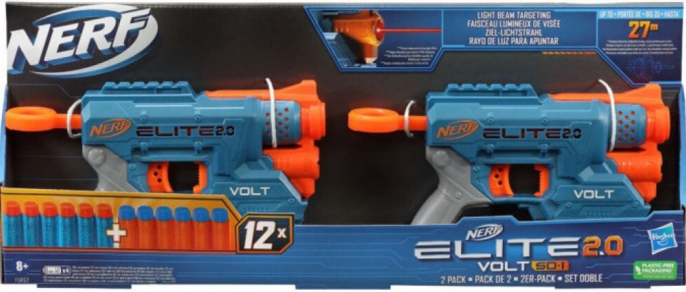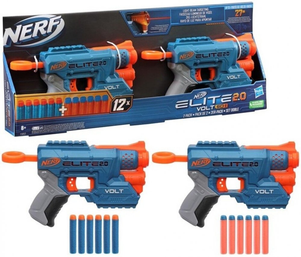 Hledáte Pistole Nerf Elite 2.0 Volt SD1 2ks ? U nás za skvělou cenu 572,00 Kč! Neváhejte a nakupte u profesionálů. Toto akční dvojbalení obsahuje 2 blastery vybavené světelným paprskem a 12 šipek Nerf Elite. Světelný paprsek funguje na cíle vzdálené až 4,5 metru. Potřebné 2x 1,5 V AAA baterie (nejsou součástí balení).