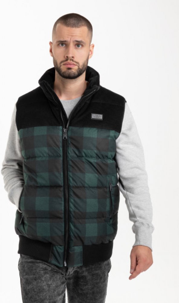 Pánská vesta z kolekce PitBull West Coast - CONVOY - klasický střih - vyrobeno z tkaniny imitující tkanou bavlnu, která je odolná vůči větru a dešti - paže a stojáček ze silného bavlněného manšestru - celá vesta je silně zateplen a podšitá hřejivou fleecovou podšívkou - dvě boční kapsy se zipy - praktická kapsa uvnitř vesty - široký žebrovaný pevný lem ve spodní části - malý kovový znak na hrudi -...