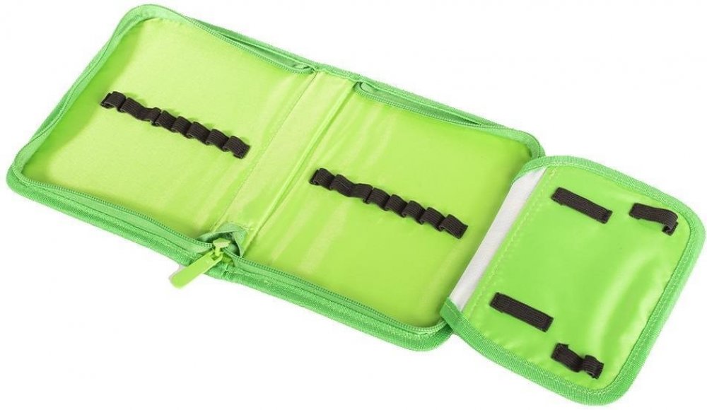 Jednopatrový školní penál s jednou klopou je vybaven šestnácti klasickými gumovými úchyty na pero, pastelky nebo fixy a čtyřmi širšími úchyty na pravítko, kružítko či nůžky.