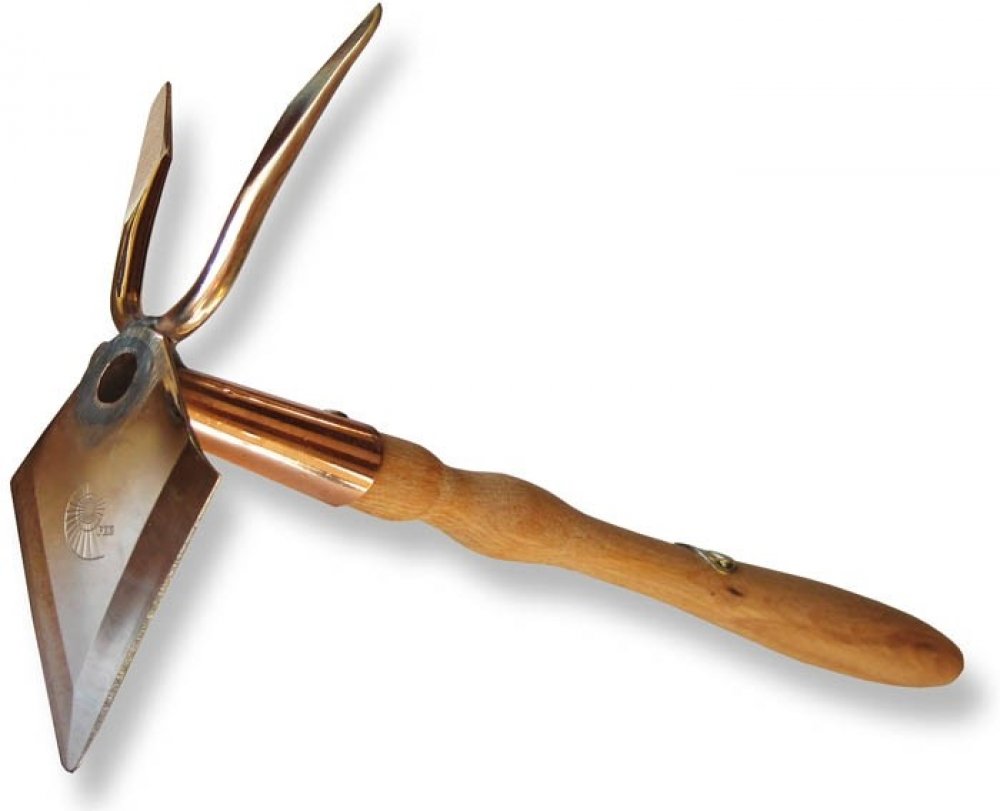 PhoenixMalá dvouzubá motyčka – klasický nástroj s krásným designem.Plocha motyčky zdůrazňuje svým šípovitým tvarem schopnost snadno pronikat do půdy. Vykované ostří je třeba brát vážně - může ohrozit i vlastní prsty. V prvé řadě je však ostří určeno kořenům plevele. K dosažení maximální účinnosti je třeba vést motyčku při práci spíše tangenciálně (souběžně) s povrchem půdy, jen několik centimetrů pod jejím povrchem. Vzhledem k ostří i překvapivé lehkosti motyčky je vhodné osvojit si jiný způsob práce, než jaký je běžný při použití obvykle tupého a relativně těžkého nářadí.S bronzovou motyčkou se nekope směrem do půdy, ale spíše se s ní podřezává její svrchní vrstva. V dobře propracovaných půdách se motyčka jen půdou protahuje. Bronzové trny jsou rovněž ostré a usnadňují narušení ztvrdlého povrchu půdy.Rukojeť z bukového dřeva.K zachování ostří čepele a trnů je vhodné čas od času okraje vyklepat (viz. Corvus nebo všeobecné pokyny). Vyklepáním dochází rovněž ke zhutnění bronzu a tím i ke zvýšení jeho odolnosti a pevnosti. Vyklepávání je tedy způsob, jak svůj nástroj stále zkvalitňovat.Na bronzovou motyčku Phoenix poskytujeme záruku 120 měsíců na kovové díly a 2 roky na dřevěnou násadu.