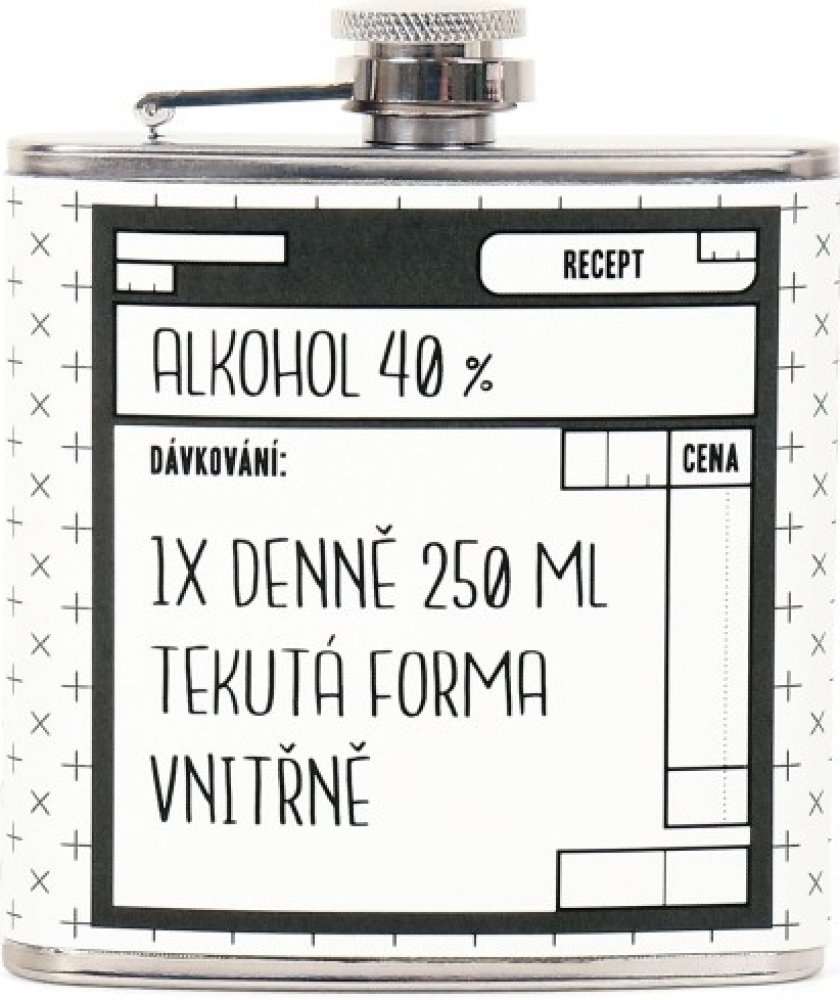 V žádné výletní výbavě by neměla chybět pořádná placatka. Její kvalitní obsah zahřeje na horách i ve městě. Každá placatka má vtipný design a je zabalena v bílé papírové krabičce - bude se tak snadno balit jako dárek. Placatky nejsou vhodné do myčky nádobí nebo mikrovlnné trouby. Objem: 175 ml Materiál: nerezová ocel Rozměry balení: 9,5 cm × 11,5 cm × 2,5 cm.