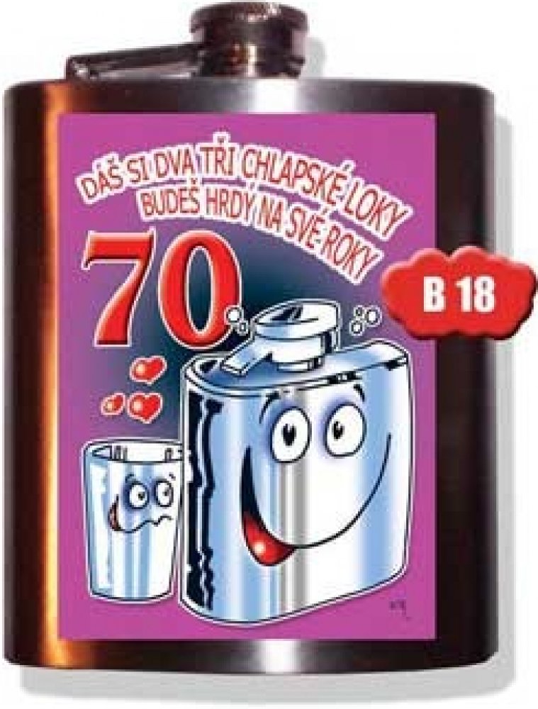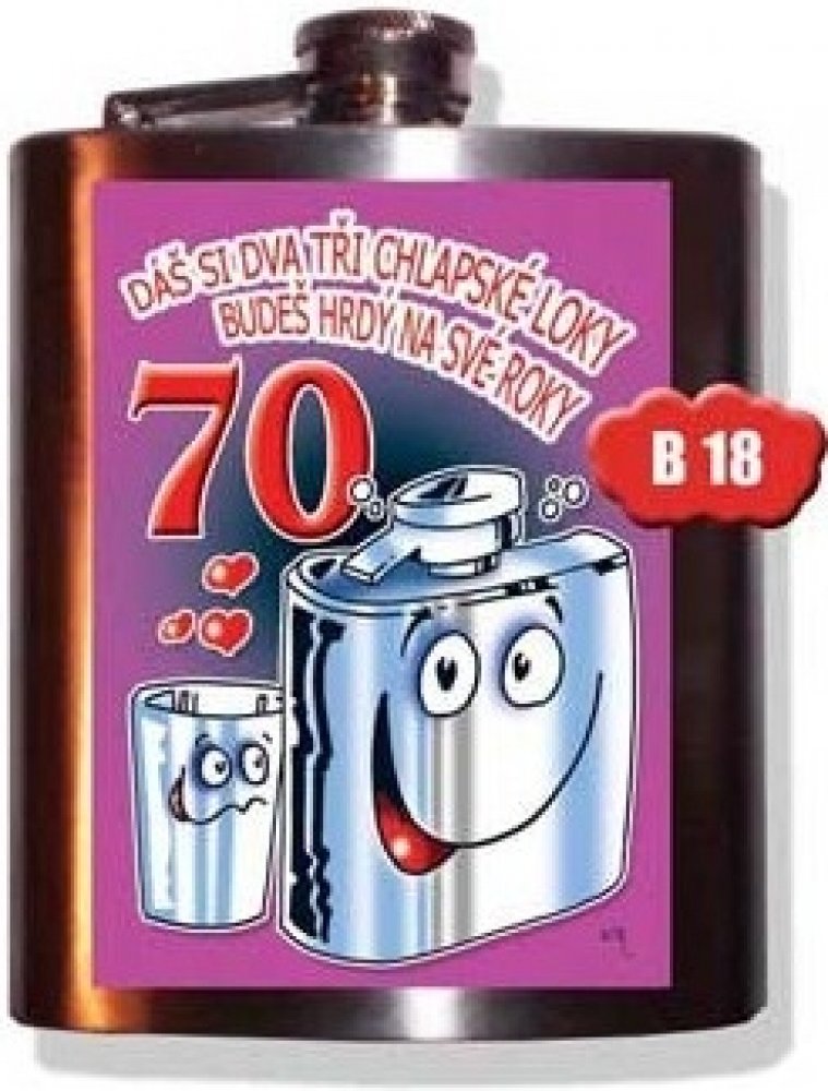 Váš dědeček nebo tatínek slaví narozeniny a hledáte pro něj nejvhodnější dárek k jeho 70tinám? Už nehledejte a kupte mu tuto prvotřídní placatku. Placatka - Dáš si dva tři chlapské loky 70, povzbudí humorným nápisem a zachrání Vás v případě, kdy potřebujete dodat šťávu. Placatku můžete mít stále po ruce a nosit v ní uschovaný Váš oblíbený alkoholický nápoj. Užívejte si života až do dna s touto net...