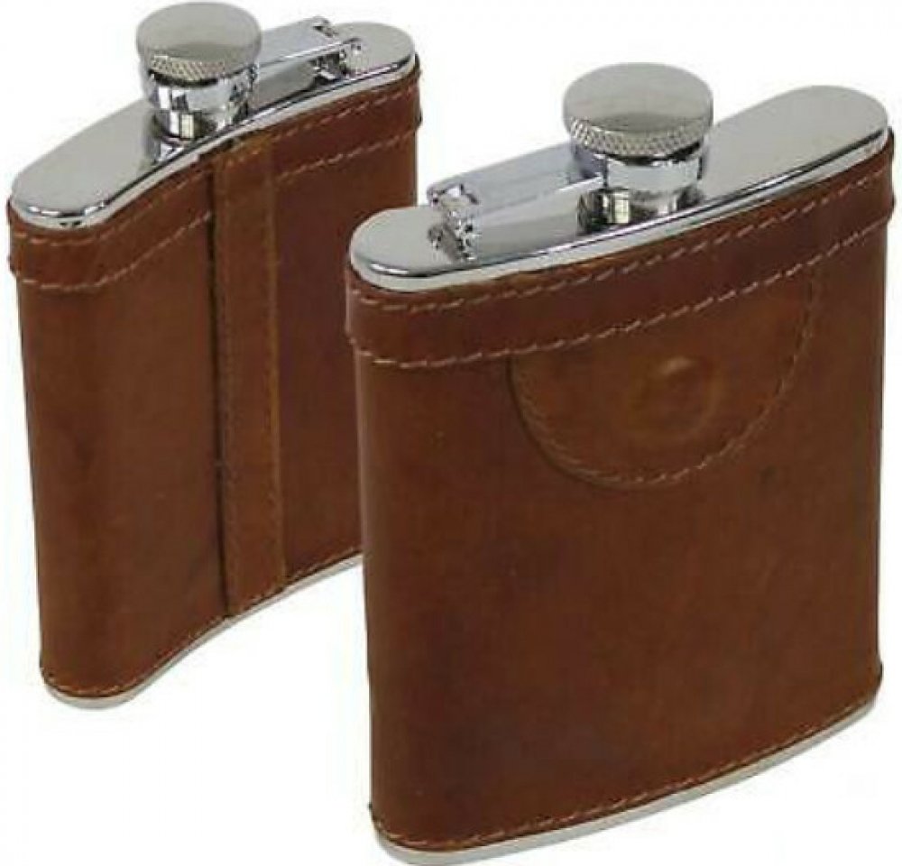 Placatka z nerezové oceli 8 02 s obalem z hovězí kůže. Láhev má masivní šroubovací uzávěr s vnitřním závitem. Uzávěr je spojen s láhví. Láhev je mírně zaoblená, aby přesně padla do náprsní kapsy.