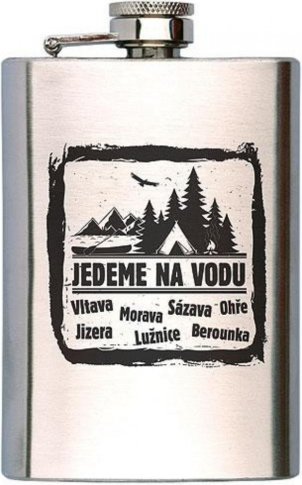 Nerezová placatka na alkohol 200 ml s potiskem pro vodáka - Jedeme na vodu. Vodácká butylka na alkohol je krásný dárek pro vodáka a milovníky splouvání řek.