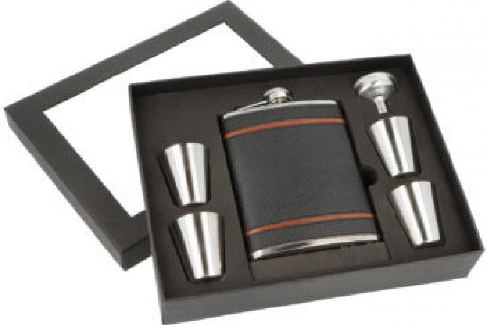 Sada nerezová placatka na alkohol s pohárky a nálevkou. Likérka je vyrobená z kvalitní nerezové oceli s leštěným povrchem. Placatka je potažená černou koženkou v kombinaci s hnědými pruhy. Likérka klasického oblého, prohnutého tvaru je vybavená šroubovacím uzávěrem a držákem víčka, který zabrání jeho ztrátě. Koženkový potah s látkou dodává placatce nevšední vzhled a je příjemný na dotek. Čtyři pohárky a nálevka jsou vyrobené z kvalitního nerezu. Mějte i na cestách při sobě Váš oblíbený nápoj. Skvělý dárek, kterým určitě potěšíte své blízké či kamarády. Placatka s pohárky je dodávaná v dárkové krabičce.Objem: 207 ml / 7 ozRozměry (Š x H x V): 95 x 25 x 134 mmMateriál: nerezová ocel