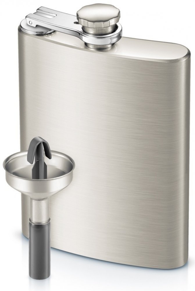 Nerezová placatka s nálevkou proti přelití.