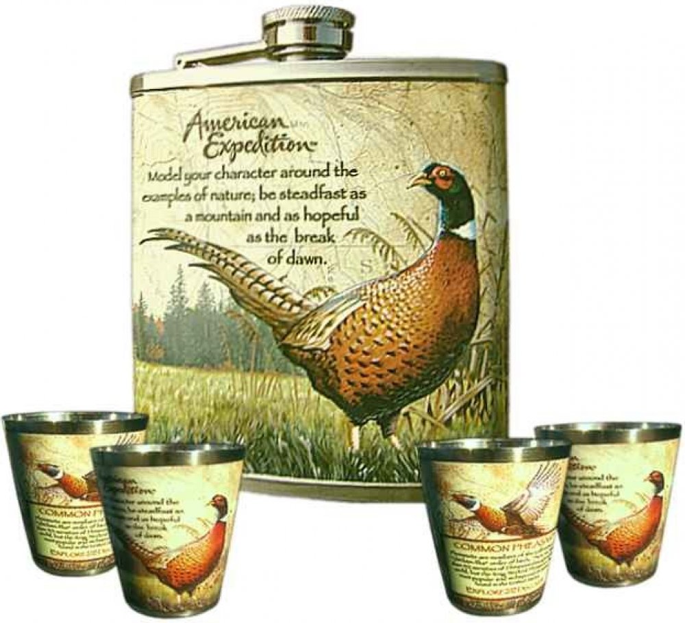 specifikace: nerezová placatka s motivem bažanta na obou stranách likérky a také na pohárku