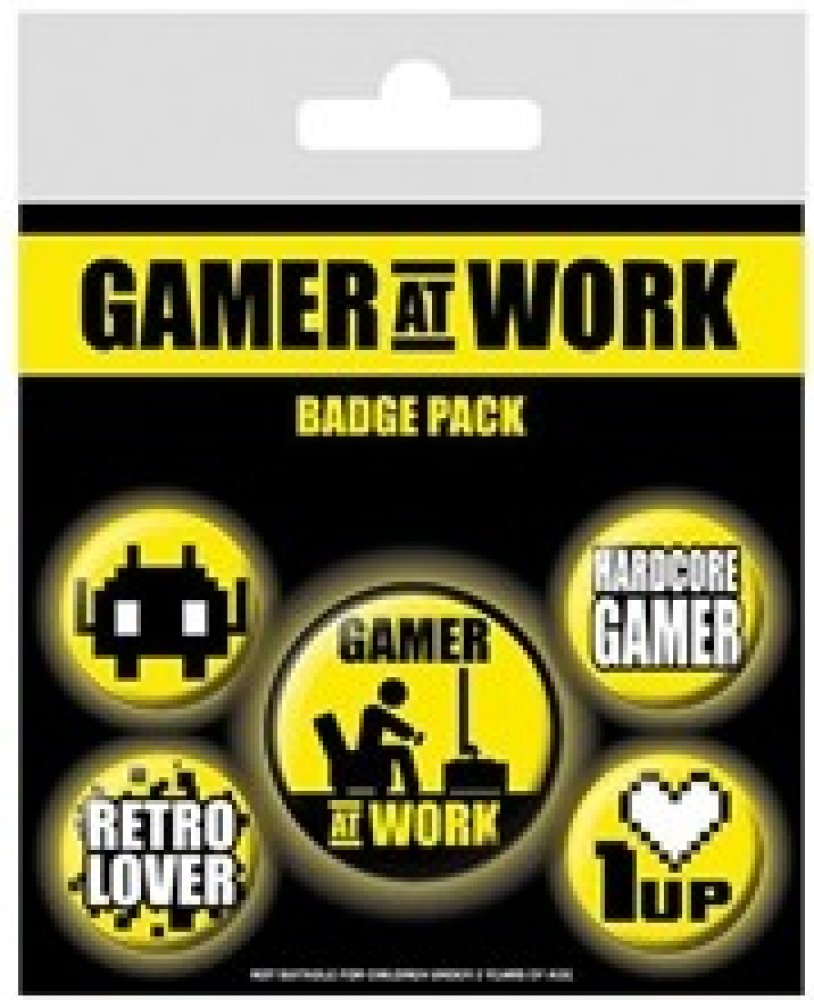 Oficiální placky z katalogu produktů s logem, fotografiemi a grafikou Gamer at work.