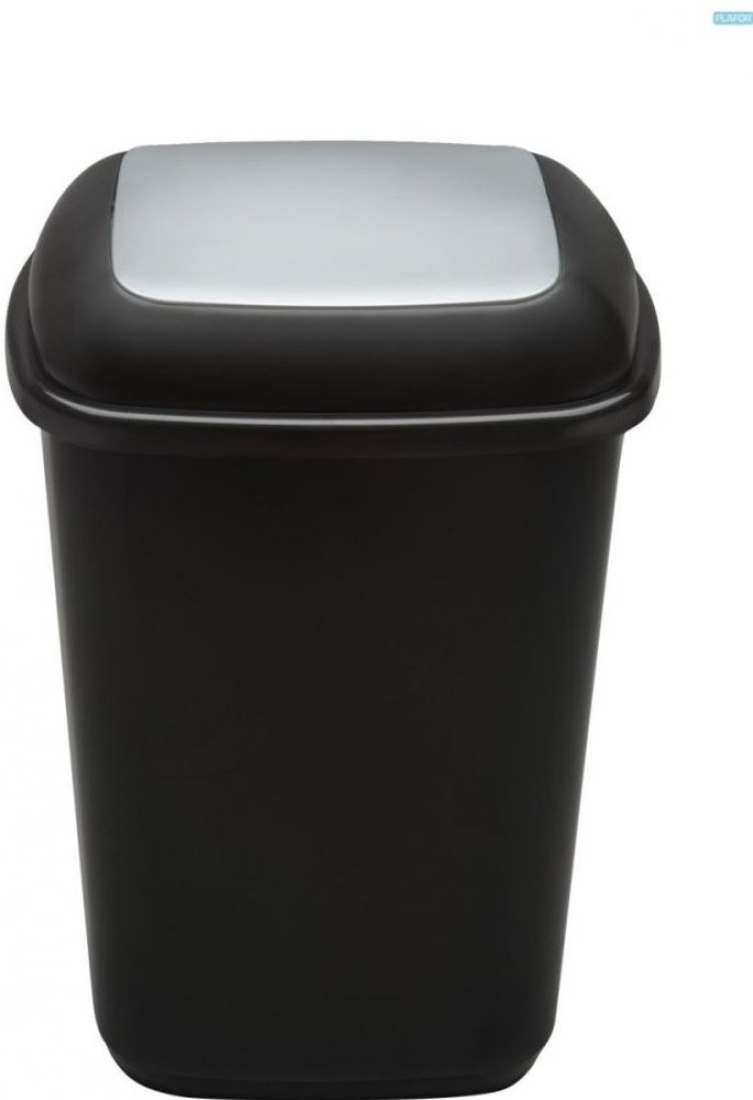 Moderní plastový odpadkový koš o objemu 45 l z černého plastu na tříděný odpad se stříbrnou klapkou ve víku. Víko s pružinou je odnímatelné. Koš označen samolepkou (lze odlepit).