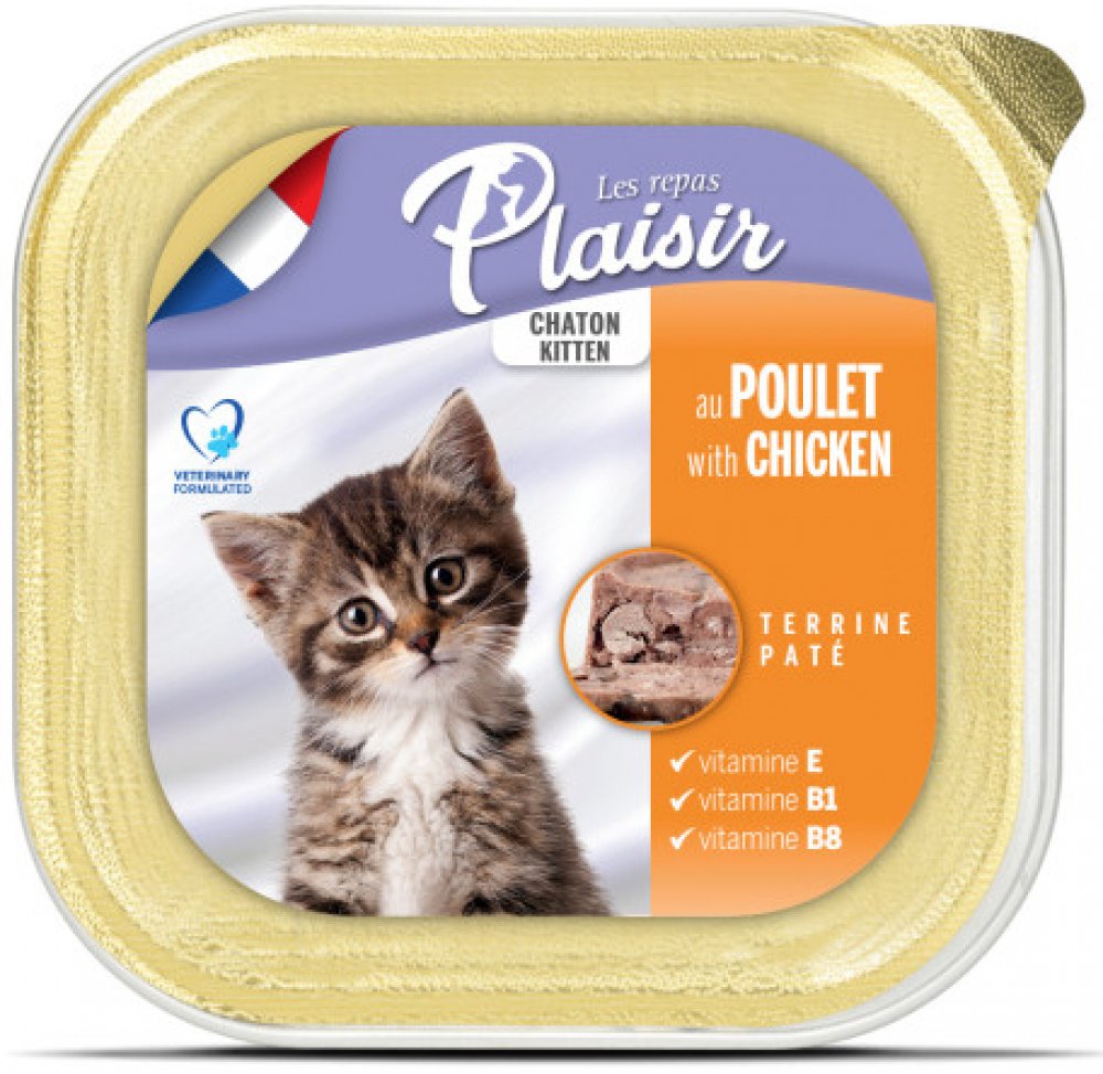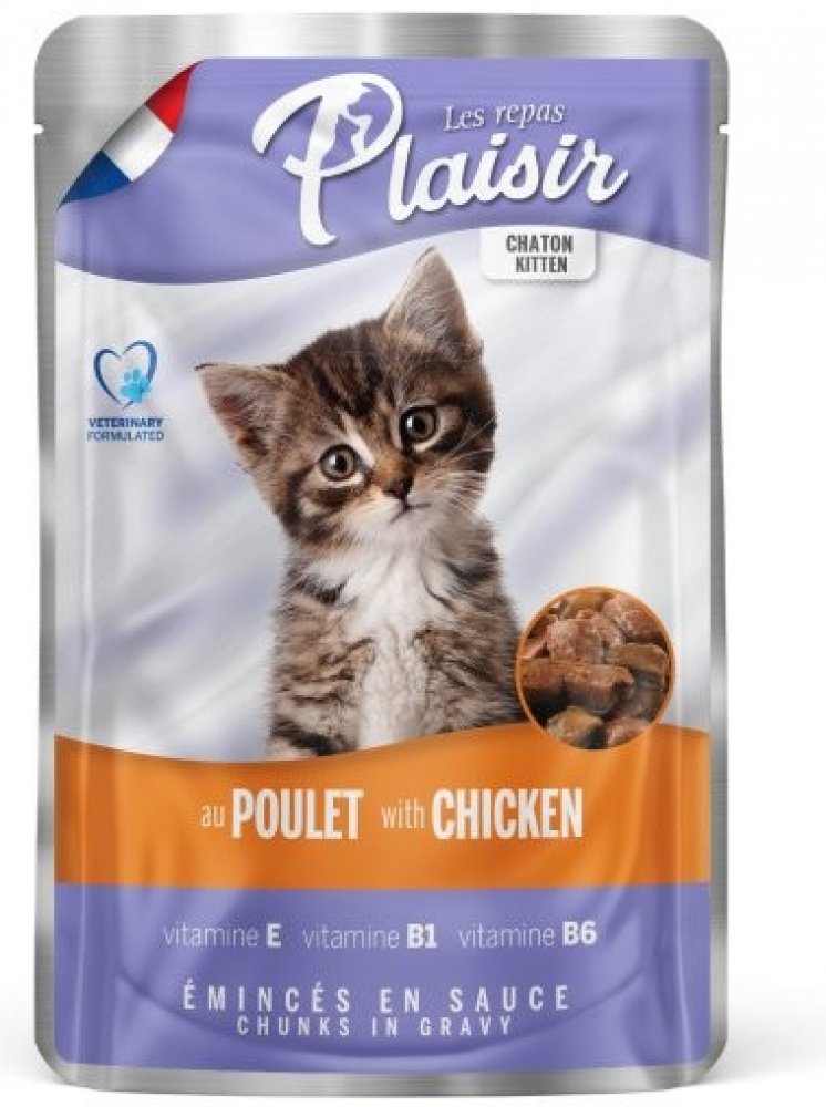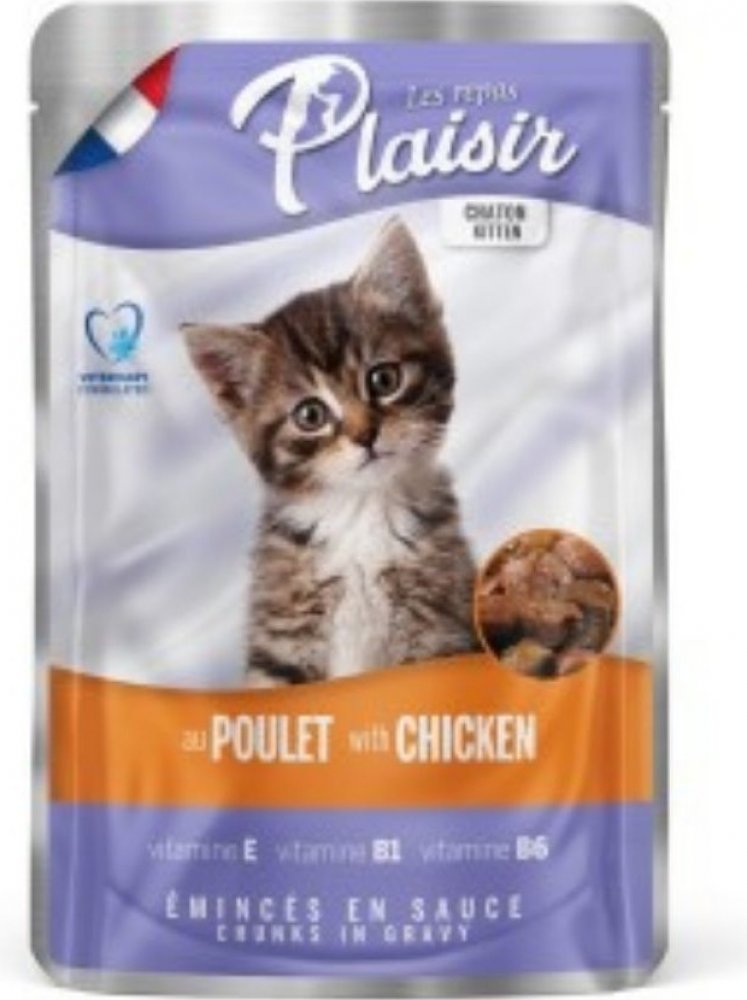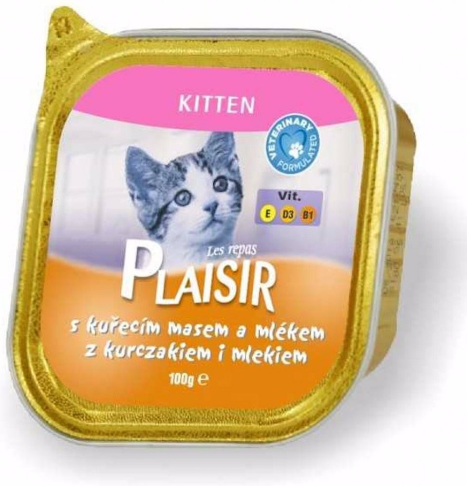 Plaisir Cat vanička kitten s kuřecím masem a mlékem je kompletní krmivo ve formě chutné vaničky s příchutí kuřecího a mlékem určené pro koťata.