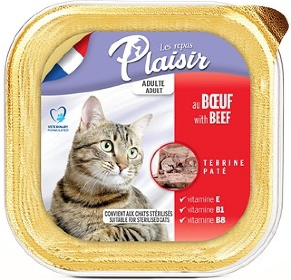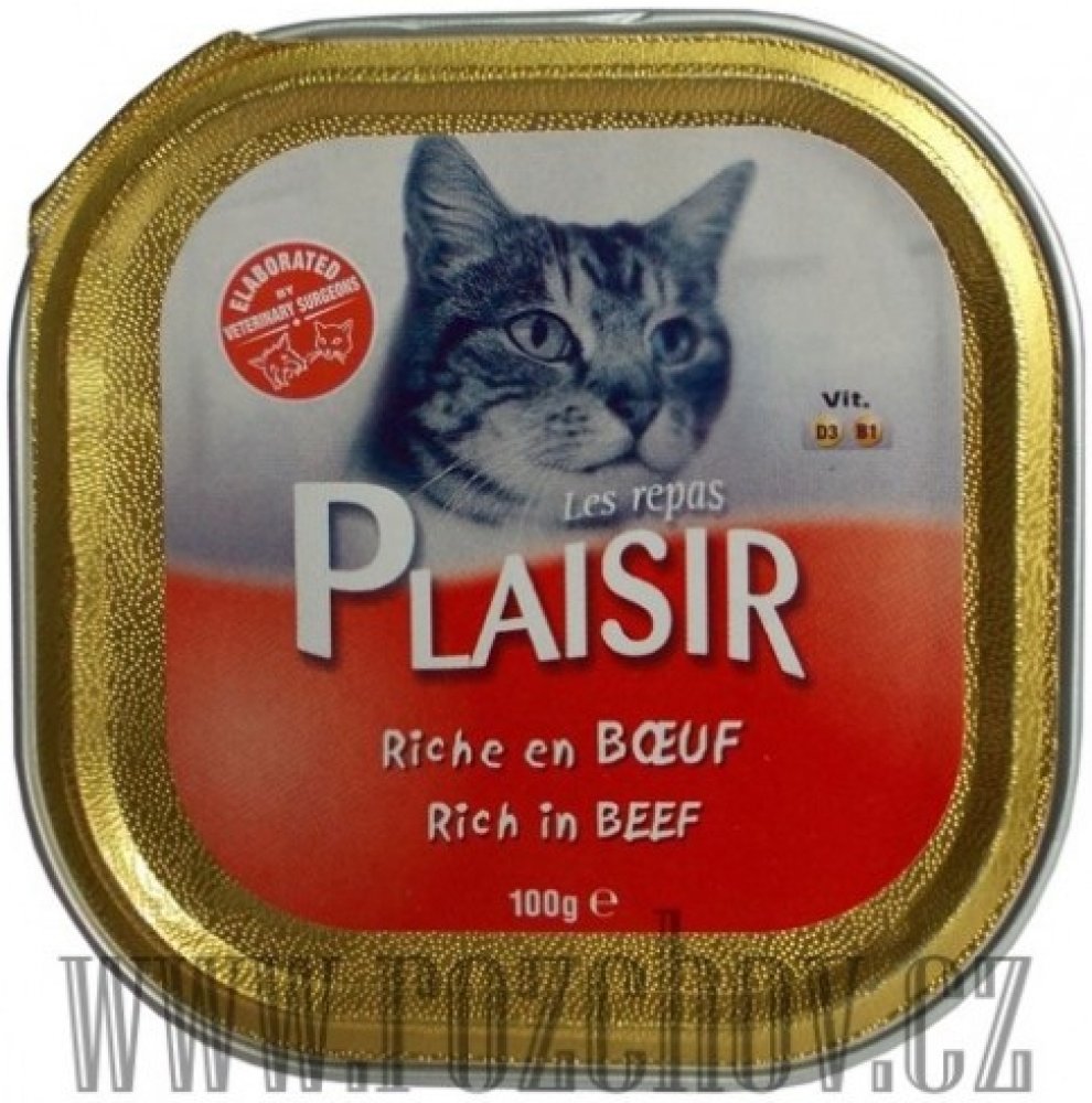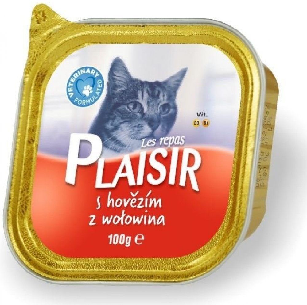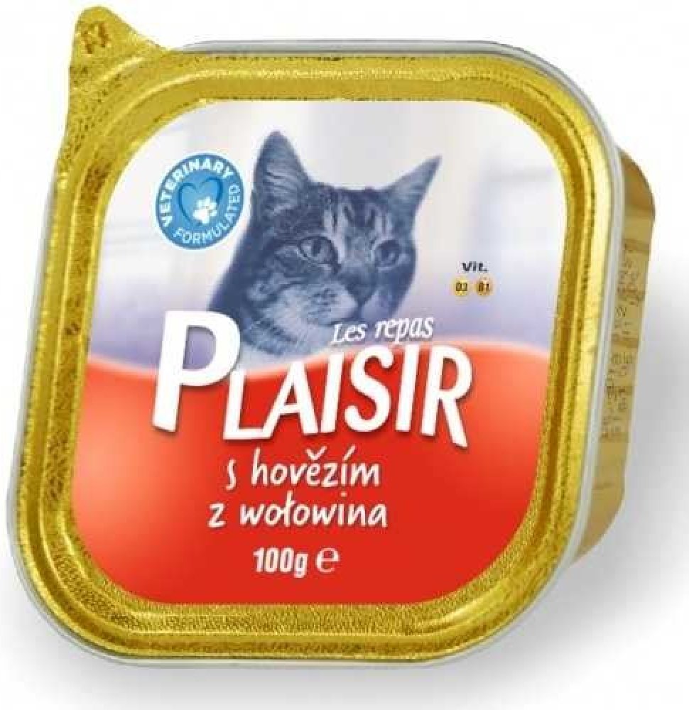 Plaisir Cat vanička hovězí je kompletní krmivo ve formě chutné vaničky s příchutí hovězího určené pro dospělé kočky.