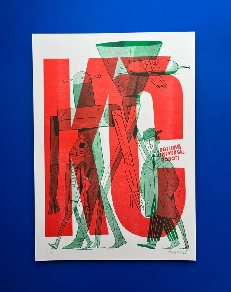 Signovaný tisk na motivy knihy Karla Čapka R.U.R v tubusu.