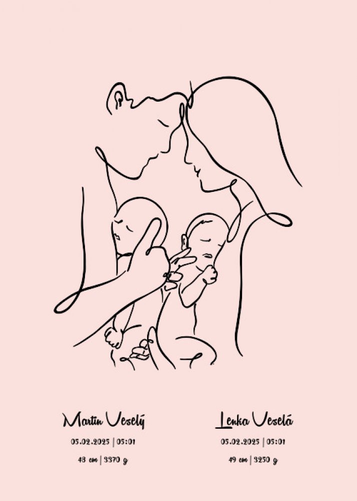 Navrhněte si sami vlastní plakát připomínající narození Vašeho miminka, vyberte si barvy, písmo a zadejte texty. My jej vytiskneme, zabalíme a zašleme až k Vám domů. Elegance. Radost hned dvakrát. Takto by se dal popsat plakát, na kterém jsou zobrazeny rodiče s dvojčátky. Nezapomenutelný zážitek! Pro větší eleganci, vám na plakát vyobrazíme jména společně s údaji narození. Navíc si můžete vybrat barvu písma, pozadí a velikost plakátu.