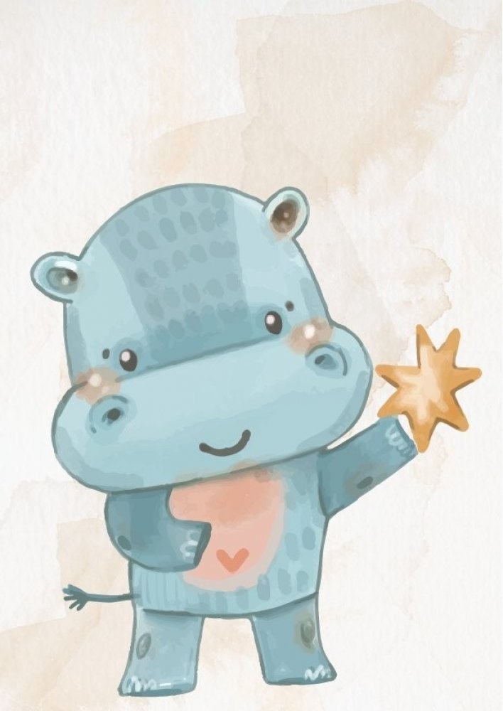 Dětský plakát 'Hrošík s hvězdičkou' z kategorie obrázky pro děti zobrazuje roztomilého hrošíka s hvězdičkou a srdíčkem na bříšku. Plakát je kreslený, ve stylu akvarelových barev. Dětské obrázky rozzáří každý pokojíček a pomohou rozvíjet dětskou představivost. Obraz můžete zavěsit na zeď samostatně nebo s v sestavě s obrázky s podobným motivem a vytvořit tak svému dítku dokonalou dětskou galerii. I...