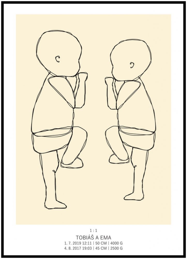 Plakát Vaše miminko v životní velikosti 50 x 70 cm Barva pozadí: Žlutá, Ležící na: Pravé i levé straně (vyberte pro sourozence), Počet vyobrazených miminek: Dva sourozenci, Varianta: Dvojitým tahem