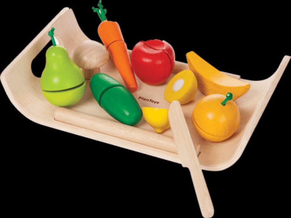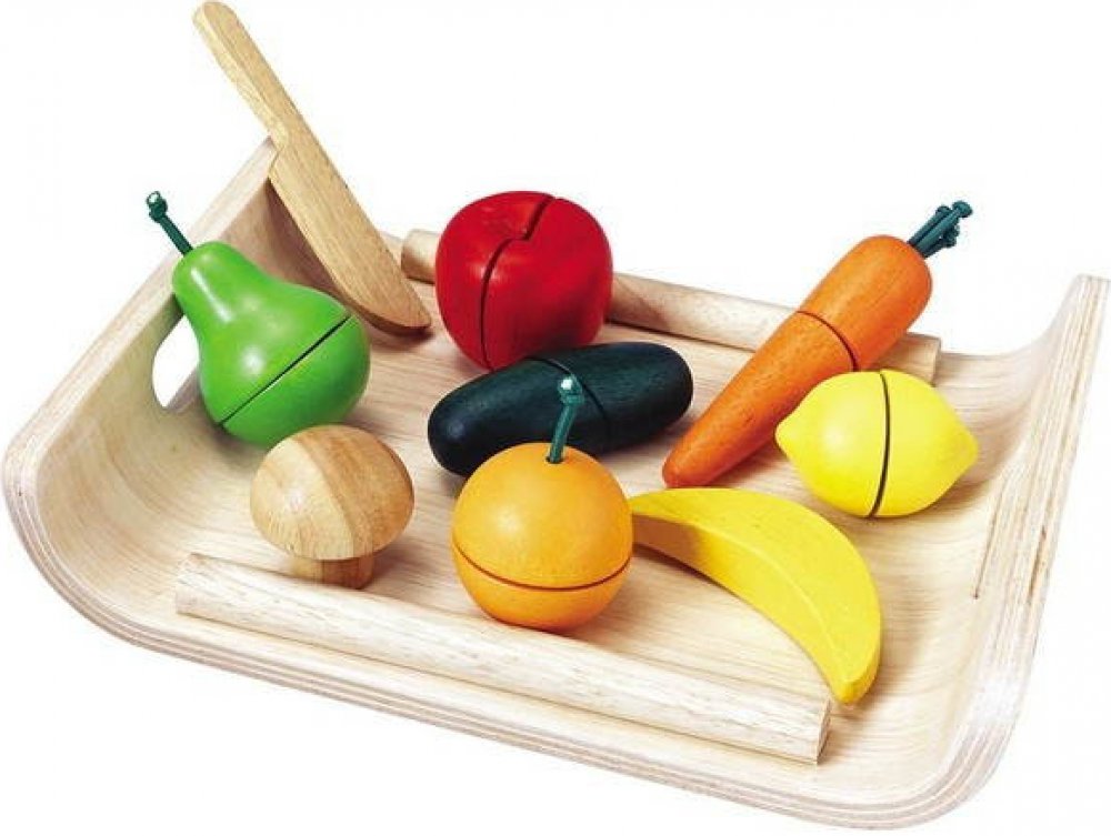 Tato sada obsahuje jablko, hrušku, citron, pomeranč, banán, okurku, houbu, mrkev, nůž a podnos. Rozměry: 18 x 25,5 x 5 cm Vhodné pro děti od 3 let. PLAN TOYS Plan Toys je již 30 let úspěšně fungující firma v oboru výroby vysoce kvalitních ekologických hraček. Firma vznikla v roce 1981 na jihu Thajska a v této oblasti funguje dodnes. Ve své produkci využívá dřevo z kaučukovníků, které již neprodukují latexové mléko. Společnost toto dřevo vykupuje od farmářů, pro které již nemá žádnou hodnotu, ale rovněž dbá na to, aby byly opětovně vysazovány stromy nové. Právě použitím těchto stromů, je výroba trvale udržitelná, ekologická a navíc z vysoce kvalitního materiálu. Výrobní proces je navržen tak, aby se za využití solární energie a biomasy maximálně šetřila energie a nedocházelo k žádné produkci odpadu. PlanToys používá ve své výrobě hraček lepidlo bez formaldehydů a barvy na vodní bázi, které jsou bezpečné, bez olova a jiných těžkých kovů. Pro obaly a tištěné materiály se využívá recyklovaný papír. Hračky mají certifikát FSC (pro ekologicky šetrné, sociálně prospěšné a ekonomicky životaschopné obhospodařování lesů) a ISO 9001 (pro vysokou kvalitu produktů) a 14001 (management životního prostředí). Firma získala akreditaci o sociální odpovědnosti (OHSAS 18001), což vypovídá o perfektním vztahu k zaměstnancům a vytváření bezpečného a zdravého pracovního prostředí. Firma zaměstnává mimo jiné také osoby se zdravotním postižením, pravidelně sponzoruje mnoho aktivit pro děti, jako jsou dětské kluby, hřiště, knihovny a herny, ale dokonce i spolupracuje s maminkami dětí s různým postižením a spolu s nimi vytváří hračky, které mohou těmto dětem pomoci. Hračky od PlanToys podporují hru, kreativní mysl a učí děti o světě kolem nás. O jejich úspěchu vypovídají také desítky ocenění z celého světa.