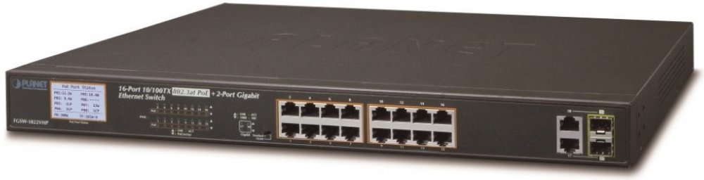 Jedná se o 16-portový 10/100Mbit fast ethernet switch se 2-mi Gigabitovými TP/SFP rozhraními. Umožňuje napájet další zařízení jako jsou IP kamery, VoIP telefony a WiFi přístupové body. Zařízení disponuje plně propustnou rychlou interní páteřní sběrnicí. Gigabitová rozhraní poskytují další možnosti rozšiřitelnosti, flexibility a integrace v síti. LCD displej na předním panelu informuje o aktuálním vytížení PoE.
