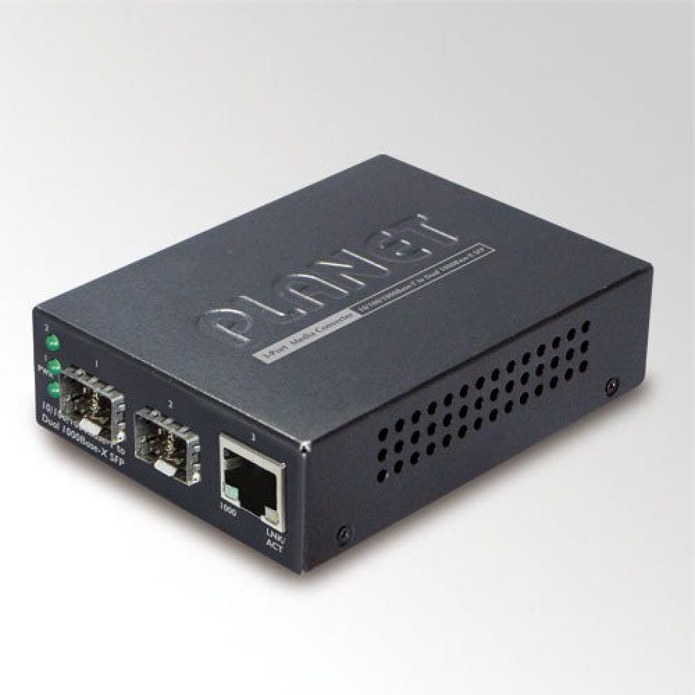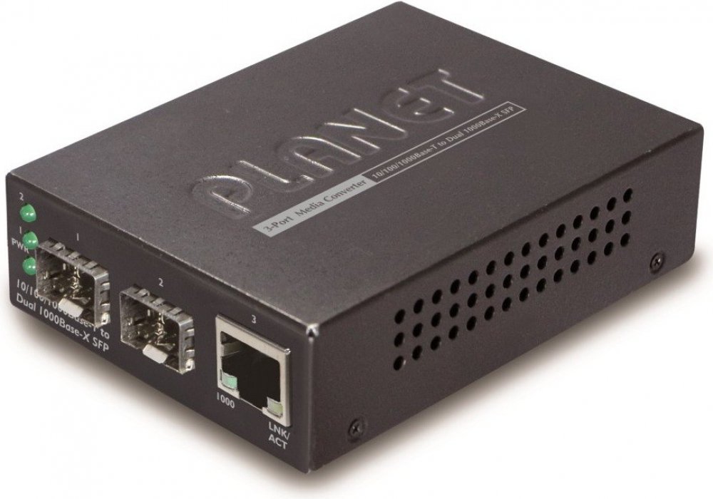 Kompaktní konvertor pro gigabitové sítě Ethernet pro snadný přechod mezi metalickým a optickým vedením. Nabízí dva SFP porty 100/1000Base-X pro připojení k optické síti nebo pro připojení koncových zařízení a jeden port 10/100/1000Base-T (RJ-45) pro připojení k metalické síti. Konvertor lze intstalovat do šasi MC-700, MC-1500, MC-1500R.