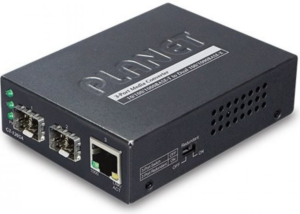Skrze vestavěný DIP přepínač na boční straně lze GT-1205A nakonfigurovat jako 3-portový Ethernet switch nebo 2-portový redudantní media konvertor. V režimu switche může GT-1205A pracovat s vysokým výkonem díky mechanismu Store-and-Forward. Naopak v režimu konvertoru poskytuje redudantní připojení pro kritické ethernetové aplikace a podporuje funkci automatického obnovení. V případě výpadku signálu na primárním portu dojde k přepnutí na záložní port.