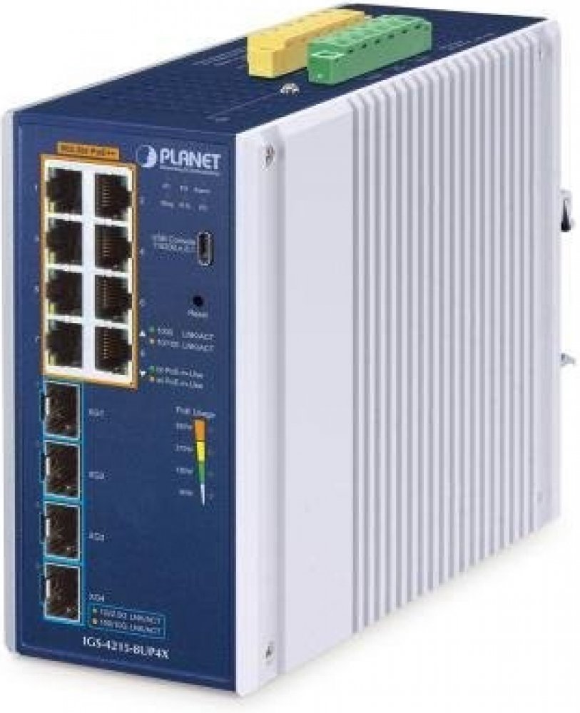 PLANET IP30 Industrial L2/L4 8-Port. Typ přepínače: Řízený, Přepínač vrstev: L2/L4. Typy přepínaných ethernetových portů RJ-45: Gigabit Ethernet (10/100/1000), Počet přepínaných ethernetových portů RJ-45: 8, Počet instalovaných modulů SFP+: 4. Plně duplexní režim. Tabulka MAC adres: 16000 pol., Kapacita přepínání: 96 Gbit/s. Montovatelné na zeď